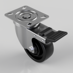 Pressed steel swivel castor with a top plate fixing fitted with a black Ditherm wheel with ball bearings and total lock Swivel Castor Brake. Wheel diameter 100mm, tread width 35mm, overall height 131mm, plate size 100mm x 85mm, hole centres 80mm x 60mm or 75mm x 45mm. Load capacity 200kg with a maximum temperature of 300c. REACH compliant, RoHs Compliant, USDA approved FDA approved.