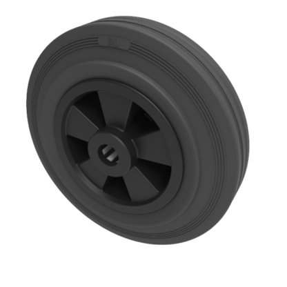 Black rubber tyre on a black polypropylene centre wheel with a roller bearing. Wheel diameter 200mm, tread width 50mm, bore 20mm, hub width 60mm. Load capacity 205kg.