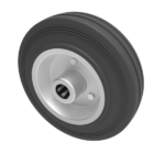 Black rubber tyre on steel disc centre with a roller bearing. Diameter 125mm, tread width 35mm, bore size 15mm, hub length 45mm. Load capacity 90kg.