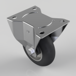 Pressed steel fixed castor with a top plate fixing with a black ergonomic black high elastic natural 55 shore A round profile rubber tyred wheel with a aluminium centre with a ball bearing. Wheel diameter 125mm, tread width 40mm, overall height 158mm, top plate 135mm x 110mm, hole centres 105mm x 80/75mm. Load capacity 200kg. REACH compliant also PAH-Free rubber to confirm to EU-directive 2005/69/EC, also available with flat tread details on request
