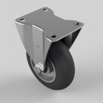 Pressed steel fixed castor with a top plate fixing with a black ergonomic grey high elastic natural 55 shore A round profile rubber tyred wheel with a aluminium centre with a ball bearing. Wheel diameter 125mm, tread width 40mm, overall height 156mm, top plate 105mm x 86mm, hole centres 80mm x 60mm. Load capacity 200kg. REACH compliant also PAH-Free rubber to confirm to EU-directive 2005/69/EC, also available with flat tread details on request