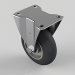 Pressed steel fixed castor with a top plate fixing with a black ergonomic high elastic natural 55 shore A round profile rubber tyred wheel with a aluminium centre with ball bearings. Wheel diameter 125mm, tread width 40mm, overall height 156mm, top plate 105mm x 86mm, hole centres 80mm x 60mm. Load capacity 200kg. REACH compliant also PAH-Free rubber to confirm to EU-directive 2005/69/EC,