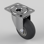 Pressed steel swivel castor top plate fixing fitted with a a black ergonomic round profile high elastic natural 55 shore A rubber tyred aluminium centred wheel with ball bearings. Wheel diameter 100mm, tread width 40mm, overall height 128mm, top plate 104mm x 80mm, hole centre 80mm x 60mm or 72mm x 52mm. Load capacity 150kg. REACH compliant also PAH-Free rubber to confirm to EU-directive 2005/69/EC