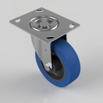 Pressed steel swivel castor with flat top plate fixing fitted with a blue 65 shore A elastic rubber tyre on black nylon centre wheel with roller bearing. Wheel diameter 125mm, tread width 36mm, overall height 156mm, top plate 135mm x 110mm, hole centres 105mm x 80mm or 116mm x 63.5mm Load capacity 250kg. REACH compliant also PAH-Free rubber to confirm to EU-directive 2005/69/EC
