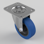 Pressed steel swivel castor with a top plate fixing fitted with a blue 65 shore A elastic rubber tyre on a black nylon centre with a roller bearing. Wheel diameter 125mm, tread width 36mm, overall height 158mm, top plate 135mm x 110mm, hole centres 105mm x 80/75mm. Load capacity 250kg. REACH compliant also PAH-Free rubber to confirm to EU-directive 2005/69/EC
