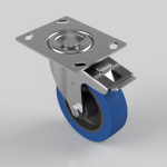 Pressed steel swivel castor with flat top plate fixing fitted with a blue 65 shore A elastic rubber tyre on black nylon centre wheel with roller bearing and a total lock brake . Wheel diameter 125mm, tread width 36mm, overall height 156mm, top plate 135mm x 110mm, hole centres 105mm x 80mm or 116mm x 63.5mm Load capacity 250kg. REACH compliant also PAH-Free rubber to confirm to EU-directive 2005/69/EC