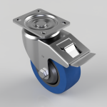 Pressed steel swivel castor with a top plate fixing with a 65 shore A blue elastic rubber tyre wheel with a black nylon centre with ball bearing and a total lock brake. Wheel diameter 125mm, tread width 50mm, overall height 166mm, top plate 105mm x 86mm, hole centres 80mm x 60mm. Load capacity 275kg. REACH compliant also PAH-Free rubber to confirm to EU-directive 2005/69/EC