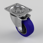 Pressed steel swivel castor with flat top plate fixing fitted with a blue 75 shore A elastic rubber tyre on black nylon centre with roller bearing. Wheel diameter 100mm, tread width 38mm, overall height 128mm, plate size 105mm x 86mm, hole centres 80mm x 60mm. Load capacity 250kg.