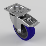Pressed steel swivel castor with a top plate fixing fitted with a blue 75 shore A elastic rubber tyre on a black nylon centred wheel with a roller bearing and total lock brake. Wheel diameter 125mm, tread width 40mm, overall height 155mm, top plate 105mm x 86mm, hole centres 80mm x 60mm. Load capacity 250kg.