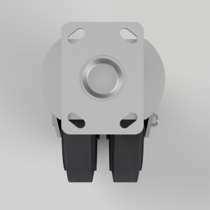Twin wheeled swivel castor with a top plate fixing fitted with 2 65 shore A black elastic rubber cast iron centred wheels with ball bearings. Wheel diameter 2 x 200mm, tread width 2 x 50mm, overall height 250mm, top plate 150mm x 110mm, hole centres 105mm x 80mm or 121mm x 59mm. Load capacity 1000kg. – At 6 kph speed, the load of each wheel is advised to be 80% of the load at 4kph – At 10 kph speed, the load of each wheel is advised to be 55% of the load at 4 kph. – At 16 kph speed, the load of each wheel is advised to be 45% of the load at 4kph. – At 20 kph speed, the load of each wheel is advised to be 35% of the load at 4 kph. – No data for elastic rubber wheel over 20 kph.