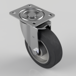 Pressed steel swivel castor with a top plate fixing with a black elastic rubber tyred wheel with a aluminium centre with ball bearing. Wheel diameter 125mm, tread width 40mm, overall height 156mm, top plate 105mm x 86mm, hole centres 80mm x 60mm. Load capacity 250kg. REACH compliant also PAH-Free rubber to confirm to EU-directive 2005/69/EC