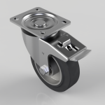 Pressed steel swivel castor with a top plate fixing with a black elastic rubber tyred wheel with a aluminium centre with ball bearings and total lock brake. Wheel diameter 125mm, tread width 40mm, overall height 155mm, top plate 105mm x 86mm, hole centres 80mm x 60mm. Load capacity 250kg. REACH compliant also PAH-Free rubber to confirm to EU-directive 2005/69/EC