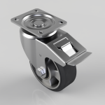 Pressed steel swivel castor with a top plate fixing with a black high elastic natural 65 shore A rubber tyred wheel with a aluminium centre with ball bearings and total lock brake. Wheel diameter 125mm, tread width 50mm, overall height 166mm, top plate 105mm x 86mm, hole centres 80mm x 60mm. Load capacity 270kg. REACH compliant also PAH-Free rubber to confirm to EU-directive 2005/69/EC