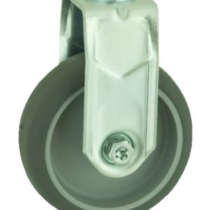 Grade 304 Pressed stainless steel swivel castor with a 10mm bolt hole fitted with a grey electrically conductive rubber tyre on polypropylene centred wheel with a plain bore and a total lock brake. Wheel diameter 100mm, tread width 24mm, overall height 124mm. load capacity 70kg.Conductive offers a resistance R<10__
