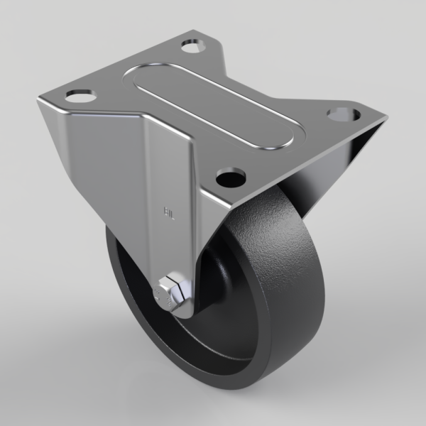Pressed steel fixed castor with a top plate fixing fitted with a 280C grey technopolymer reinforced with glass fiber wheel with a plain bore and a stainless steel axle tube. Wheel diameter 100mm, tread width 32mm, overall height 128mm, top plate 105mm x 85mm, hole centres 80mm x 60mm Load capacity 180kg. (BIL always recomend using a PTFE bush in case of wheel scream)