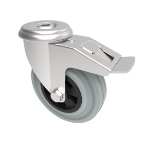 Grade 304 Pressed stainless steel swivel castor with a 12 mm bolt hole fitted with a grey rubber tyred black polypropylene centred wheel with a roller bearing. Wheel diameter 125mm, tread width 37.5mm, overall height 155mm,Load capacity 90kg.