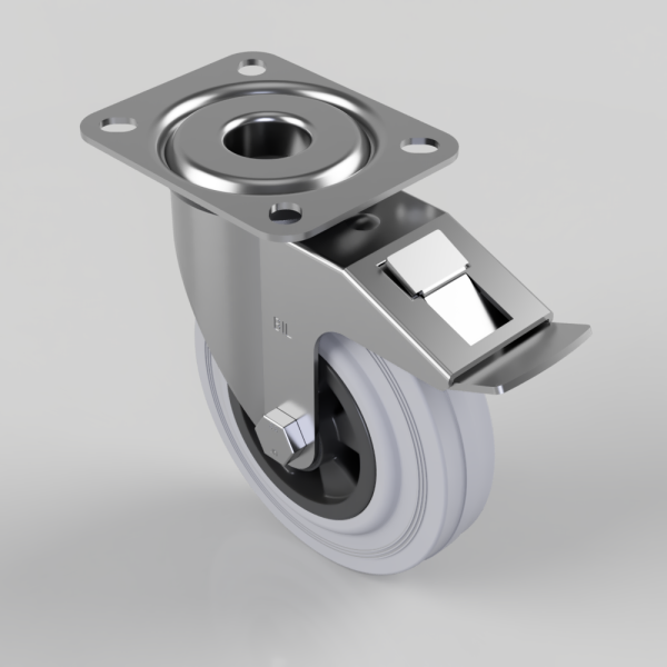 Pressed steel swivel castor with top plate fixing fitted with a grey rubber tyre on black polypropylene centre with roller bearing and total lock brake. Wheel diameter 125mm, tread width 37.5mm overall height 155mm, plate size 105mm x 85mm, hole centres 80mm x 60mm. Load capacity 100kg.