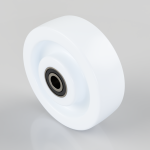 White nylon wheel with a ball bearing. Wheel diameter 160mm, tread width 50mm, bore size 20mm, hub length 60mm. Load capacity 850kg.