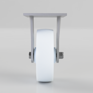 Fabricated fixed castor with a top plate fixing fitted with a white nylon wheel with a plain bearing. Wheel diameter 150mm, tread width 45mm, overall height 190mm, top plate 135mm x 110mm, hole centres 105mm x 80mm. load capacity 500kg.