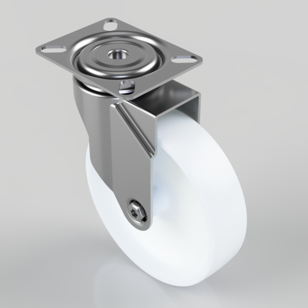 Pressed steel swivel castor with a top plate fixing fitted with a white nylon wheel with plain bore. Wheel diameter 150mm, tread width 32mm, overall height 181mm, top plate 90mm x 70mm, hole centres 75mm x 56mm or 64mm x 44mm. Load capacity 100kg.