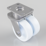 Twin wheeled fabricated swivel castor with a top plate fixing fitted with 2 white nylon wheels with plain bearings. Wheel diameter 2 x 150mm, tread width 2 x 45mm, overall height 200mm, top plate 150mm x 110mm, hole centres 105mm x 80mm or 121mm x 59mm. Load capacity 1500kg.
