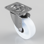Pressed steel swivel castor with a top plate fixing fitted with a white nylon wheel with ball bearings. Wheel diameter 150mm, tread width 45mm, overall height 190mm, top plate 135mm x 110mm, hole centres 105mm x 80/75mm. Load capacity 500kg.