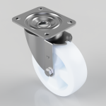 Pressed steel swivel castor with a top plate fixing fitted with a white nylon wheel with a roller bearing. Wheel diameter 160mm, tread width 50mm, overall height 195mm, top plate 135mm x 110mm, hole centres 105mm x 80/75mmmm. Load capacity 500kg.