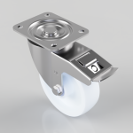 Grade 304 Pressed stainless steel swivel castor with a top plate fixing fitted with a white nylon wheel with a roller bearing and a total lock brake. Wheel diameter 150mm, tread width 45mm, overall height 190mm, top plate 135mm x 110mm, hole centres 105mm X 80/75mm. Load capacity 500kg