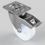 Pressed steel swivel castor with a top plate fixing fitted with a white nylon wheel with a plain bore and total lock brake. Wheel diameter 150mm, tread width 45mm, overall height 190mm, top plate 135mm x 110mm, hole centres 105mm x 80/75mm. Load capacity 500kg.