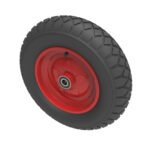 Black pneumatic tyred red steel disc centred wheel with sealed ball bearings Fitted with a 6 ply diamond tread patterned tyre. Wheel diameter 400mm, tread width 100mm, hub 65mm, bore 20mm. Load capacity 350kg for non-towing applications. Please note we manufacture to order and therefore a 24 hour delivery may not be possible..