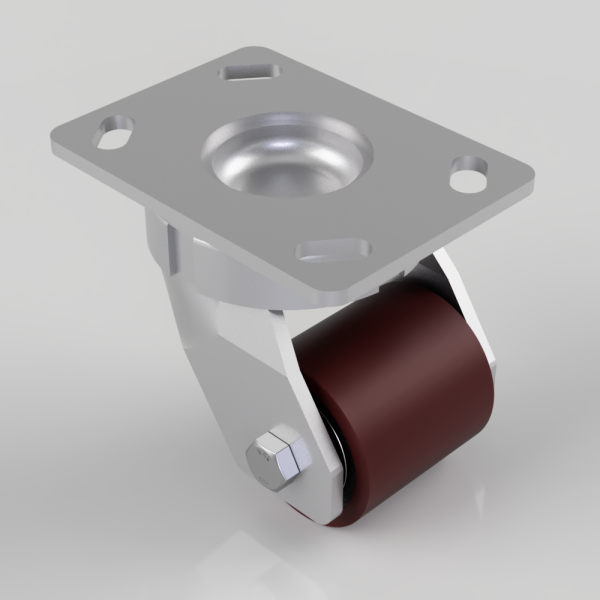 Fabricated swivel castor with a top plate fixing fitted with a polyurethane tyred steel core roller with ball bearings. Wheel diameter 70mm, tread width 70mm, overall height 127mm, top plate 150mm x 110mm, hole centres 105mm x 80mm or 121mm x 59mm. Load capacity 500kg.