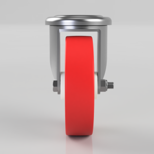 Pressed steel swivel castor with a 16mm bolt hole fitted with a red polyurethane tyre nylon centred roller bearing wheel .Wheel diameter 160mm, tread width 42mm, overall height 193mm, Load capacity 450kg.