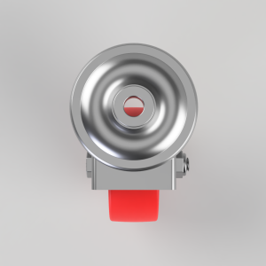 Pressed steel swivel castor with 12mm bolt hole fitted with a red polyurethane tyre on white nylon centred wheel with a plain bore. Wheel diameter 80mm, tread width 33mm, overall height 106mm,. Load capacity 210kg.