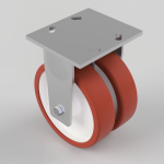 Twin-wheeled fabricated fixed castor with a top plate fixing fitted with 2 x brown polyurethane tyred nylon centred centred plain bore wheels. Wheel diameter 200mm, tread width 50mm, overall height 250mm, top plate 150mm x 175mm, hole centres 105mm x 80mm or 121mm x 59mm. Load capacity 1500kg.
