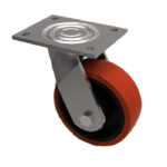 Fabricated swivel castor with a flat plate fixing fitted with a brwon polyurethane tyre on black nylon centred wheel with ball bearings. Wheel diameter 125mm, tread width 45mm, overall height 165mm, plate size 135mm x 110mm, hole centres 105mm x 80mm. Load capacity 400kg.