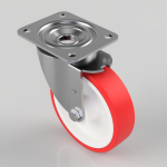 Pressed steel swivel castor with a top plate fixing fitted with a red polyurethane tyred on white nylon centre wheel with roller bearings. Wheel diameter 160mm, tread width 42mm, overall height 195mm, top plate 135mm x 110mm, hole centres 105mm x 80/75mm. Load capacity 450kg.