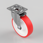 Pressed steel swivel castor with a top plate fitted with a red polyurethane tyre on white nylon cantered wheel with ball bearings, wheel diameter 200mm,tread width 50mm, overall height 235mm, top plate 135mm x 110mm with hole centres 105 x 80mm, with a load capacity of 400kg.