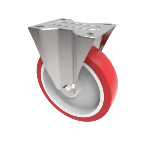Grade 304 Pressed stainless steel swivel castor with a top plate fitted with a red polyurethane tyre on white nylon centered wheel with roller bearings, 200mm wheel diameter, 50mm tread width, 235mm overall height, 140 x 110mm top plate, 105 x 80/75mm bolt holes, with a load capacity of 400kgs.