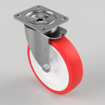 Pressed steel swivel castor with a top plate fixing fitted with a red polyurethane tyred wheel on a white nylon centre with a plain bore. Wheel diameter 200mm, tread width 48mm, overall height 238mm, top plate 135mm x 110mm, hole centres 105mm x 80/75mm. Load capacity 500kg.