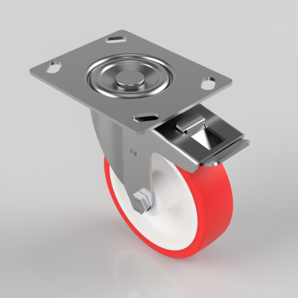 Pressed steel swivel castor with a top plate fixing fitted with a red polyurethane tyred white nylon centred wheel with a roller bearing and a total lock brake. Wheel diameter 125mm, tread width 36mm, overall height 156mm, plate size 135mm x 110mm, hole centres 105mm x 80mm or 116mm x 93.5mm. Load capacity 300kg.