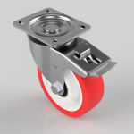 Pressed steel swivel castor with a top plate fixing fitted with a red polyurethane tyred on a white nylon centred wheel with ball bearings and total lock brake. Wheel diameter 125mm, tread width 40mm, overall height 155mm, top plate 105mm x 86mm, hole centres 80mm x 60mm. Load capacity 350kg. NB due to the fact these are reinforced nylon the white centre is slightly off white.