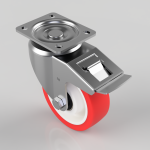 Pressed steel swivel castor with a top plate fixing fitted with a red polyurethane tyred white nylon centred wheel with ball bearings and total lock brake. Wheel diameter 125mm, tread width 40mm, overall height 166mm, top plate 105mm x 86mm, hole centres 80mm x 60mm. Load capacity 350kg. NB due to the fact these are reinforced nylon the white centre is slightly off white.