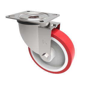 Grade 304 Pressed stainless steel swivel castor with a top plate fixing fitted with a red polyurethane white nylon centred wheel with roller bearing and total lock brake. Wheel diameter 160mm, tread width 42mm, overall height 195mm, top plate 135mm x 110mm, hole centres 105mm x 80mm. Load capacity 400kg.