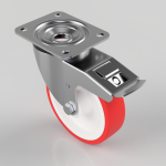 Pressed steel swivel castor with a top plate fixing fitted with a red polyurethane tyred on white nylon centre wheel with roller bearings and a total lock brake. Wheel diameter 160mm, tread width 42mm, overall height 195mm, top plate 135mm x 110mm, hole centres 105mm x 80/75mm. Load capacity 450kg.