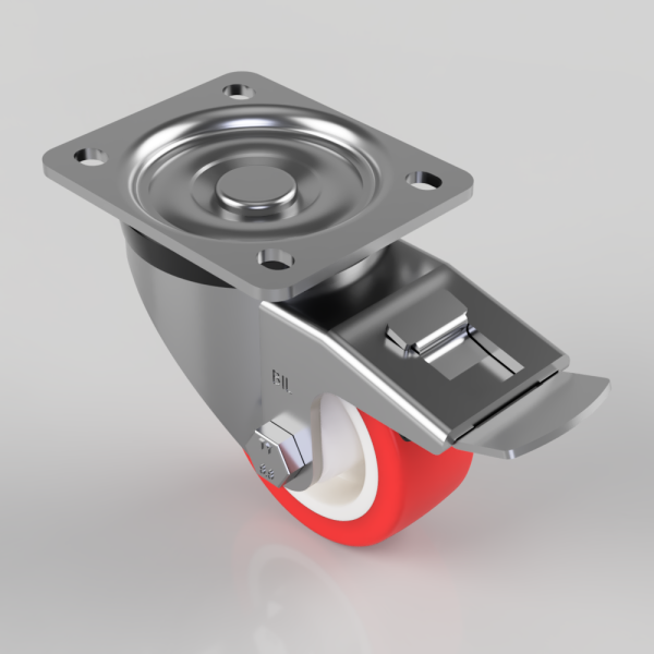 Pressed steel swivel castor with a top plate fixing fitted with a red polyurehtne tyre on white nylon centred wheel with a roller bearing and a total lock brake. Wheel diameter 80mm, tread width 33mm, overall height 110mm, top plate 105mm x 86mm, hole centres 80mm x 60mm. Load capacity 210kg.