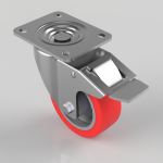 Pressed steel swivel castor with a top plate fixing fitted with red polyurethane on grey nylon wheel with a roller bearing and total lock brake. Wheel diameter 100mm, tread width 36mm, overall height 132mm, top plate 104 x 83mm, hole centres 80 x 60mm. Load capacity 250kg.
