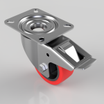 Pressed steel swivel castor with a top plate fixing fitted with red polyurethane on black nylon centred wheel with a roller bearing and total lock brake. Wheel diameter 80mm, tread width 30mm, overall height 105mm, top plate 104mm x 80mm, hole centres 80mm x 60mm. Load capacity 120kg.