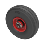 Black ribbed pattern puncture proof tyre red steel centred wheel with ball bearings. Diameter 260mm, tread width 85mm, bore size 25mm, hub length 65mm. Load capacity 120kg.for non towing applications. REACH Compliant.