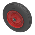 Black ribbed pattern puncture proof tyre red steel centred wheel with ball bearings. Diameter 400mm, tread width 100mm, bore size 20mm, hub length 65mm. Load capacity 200kg.for non towing applications. REACH Compliant.