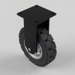 Fabricated black painted fixed castor plate fixing fitted with a black elastic rubber tyred on a steel disc centred wheel with ball bearings, Wheel diameter 406mm, tread width 104mm, overall height 535mm, plate size 230mm x 230mm, hole centres 190mm x 190mm. Load capacity 950kg at 4kph and 430kg at 16kph.
